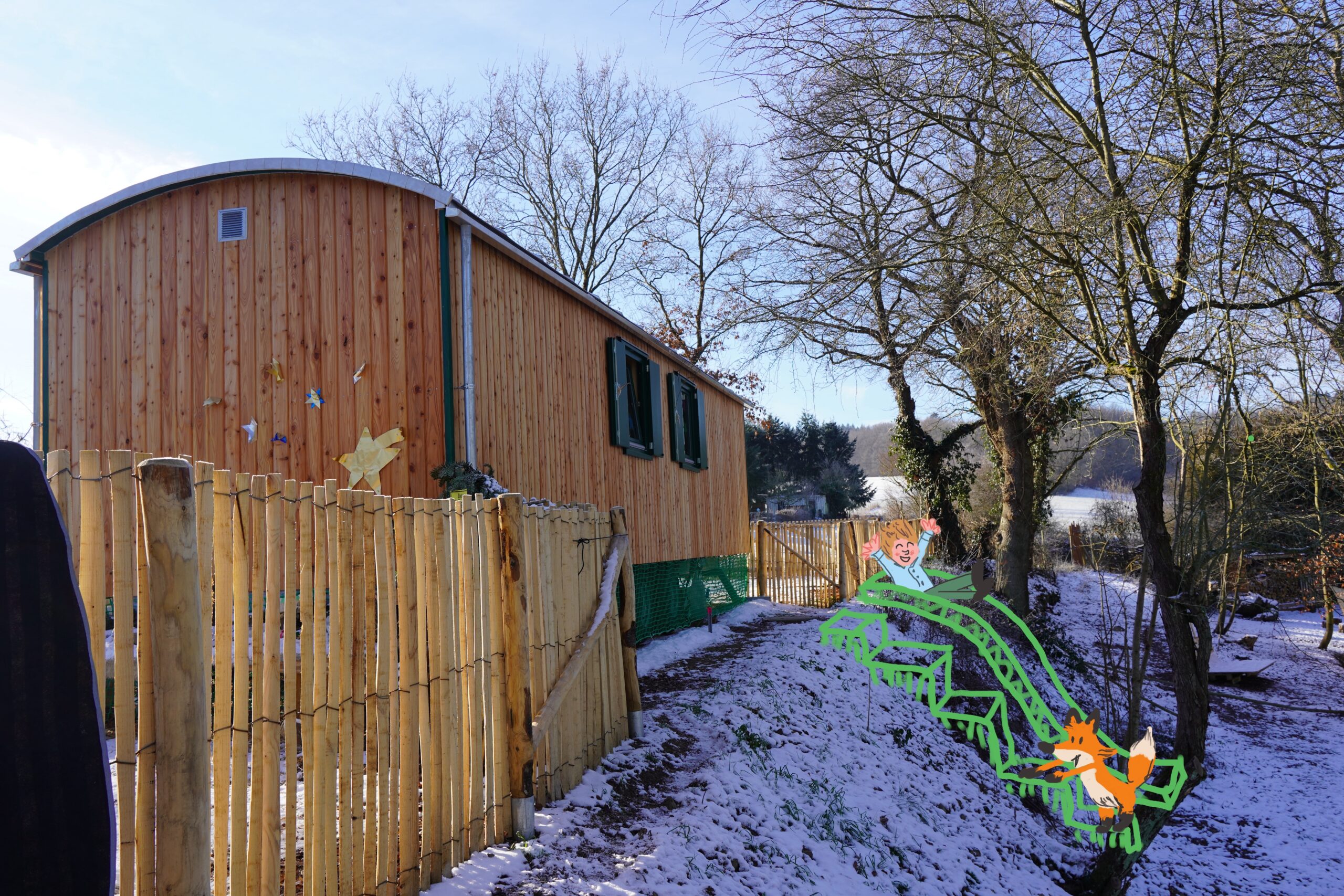 An einem geeigneten Hangabschnitt soll eine robuste und sichere Rutsche installiert werden, die perfekt zur natürlichen Umgebung passt. Sie wird aus langlebigem Material bestehen und so konzipiert sein, dass sie sich harmonisch in den Waldkindergarten integriert.